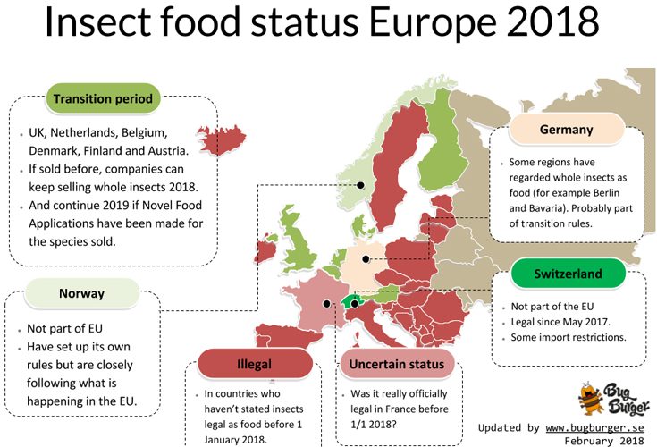 Na slici je vidljiva trenutna situacija u Evropi, veljača 2018. godine i pretpostavlja se da će takva situacija ostati tokom cijele godine. Početkom 2019. će se najvjerojatnije promijeniti i znati ćemo s kojim vrstama insekata je dozvoljeno trgovati.